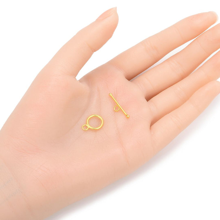 2 Sets 925 Sterling Silver Round Toggle Clasps, Real 18K Yellow Gold Plated, Size Selections: 10mm/12mm/15mm