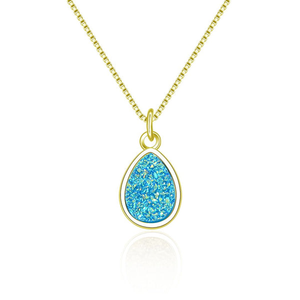 1pc Natural Druzy Crystal Pendant Necklace, Aquamarine Blue Teardrop Small Tiny Gemstone Pendant, 18 inch Gold Plated Stainless Steel Chain, GGP26-3