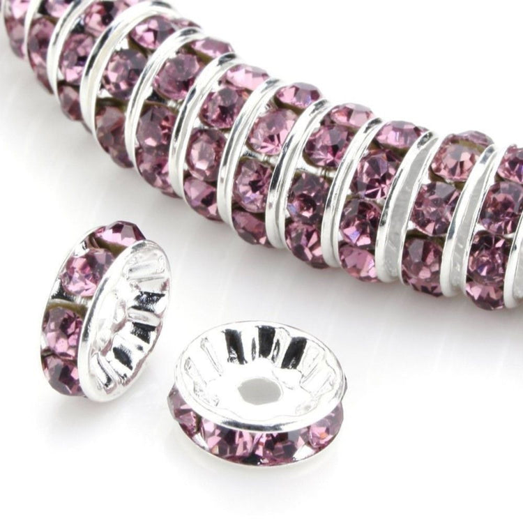 100pcs Grade A Rhinestone Rondelle Beads, Amethyst Purple Rhinestone, Sterling Silver Plated Brass, Size Selections: 5mm/6mm/8mm/10mm/12mm