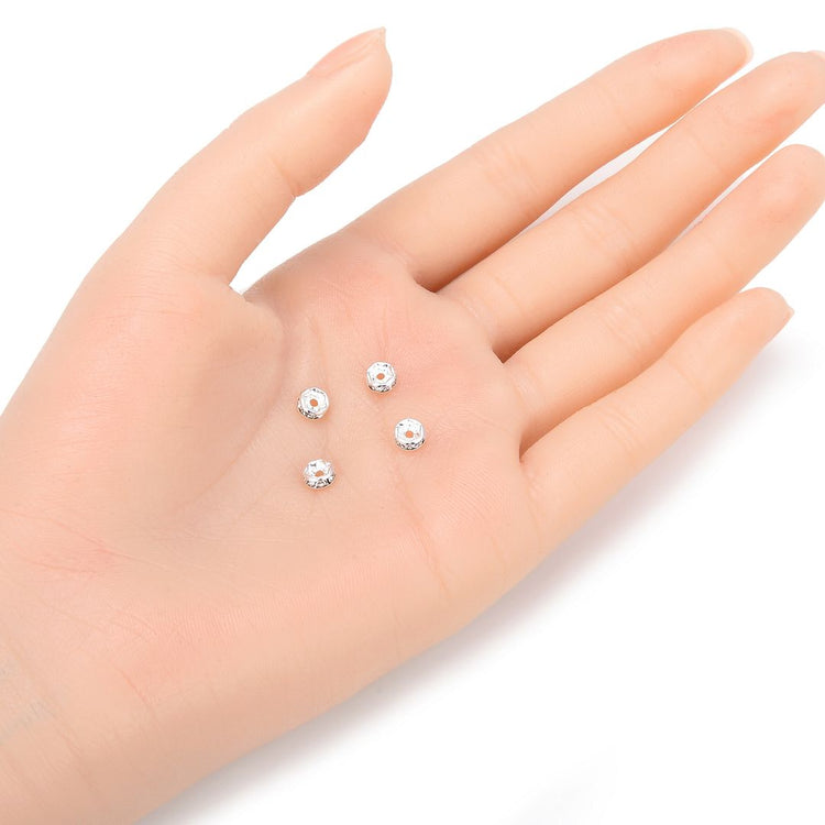 100pcs Grade A Rhinestone Rondelle Beads, Clear Rhinestone, Sterling Silver Plated Brass, Size Selections: 4mm/5mm/6mm/8mm/10mm/12mm