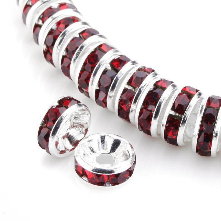 100pcs Grade A Rhinestone Rondelle Beads, Siam Red Rhinestone, Sterling Silver Plated Brass, Size Selections: 5mm/6mm/8mm/10mm/12mm