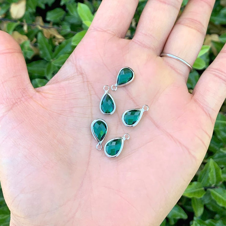 10pcs Grade A May Emerald Green Teardrop Birthstone Charm Drop, Sterling Silver Plated Brass, Size Selections: 11x7mm, 14x8mm, 16x9mm