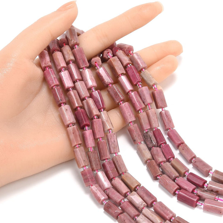 - (1 strand, about 15 inch, 26 to 28pcs beads); Stone/Material: pink rhodonite (natural, no dyed, no color enhanced, there may be natural inclusion or cracks in the beads); beautiful smooth faceted tube gemstone beads, each facets may not be precisely the same due to the hardness of the stone