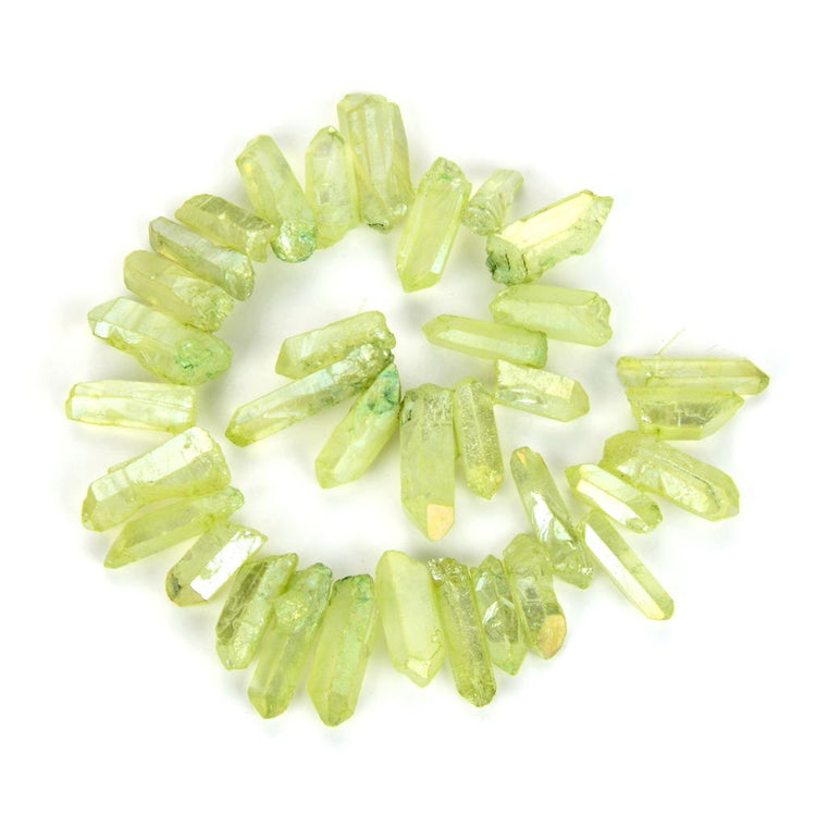 - (1 Strand, 27 to 33pcs beads per strand, about 15 inch Per strand); Stone/material: Natural Raw Crystal Quartz, Peridot Green Aurora Borealis (AB) Titanium coated crystal for jewelry craft making, Natural crystal, color enhanced in high heat and color coating would not come off; these natural crystal beads may have cracks or natural inclusion from the crystal formation;