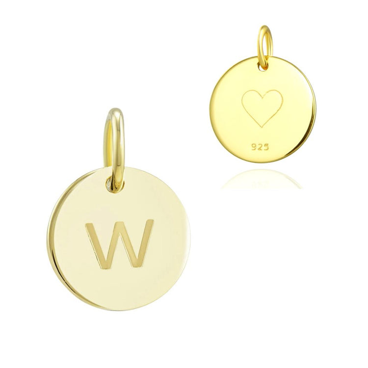 1pc 925 Sterling Silver 12mm Letter W Charm, Real 18K Yellow Gold Plated, Heart Engraved, Name Initial Disc Coin Pendant Drop, SLP-G23